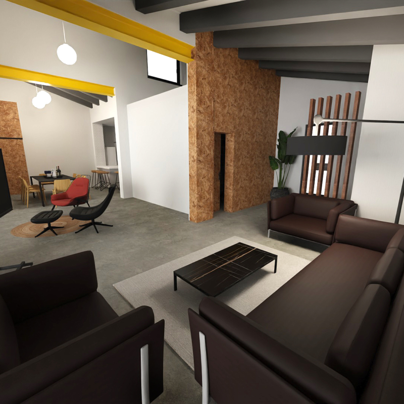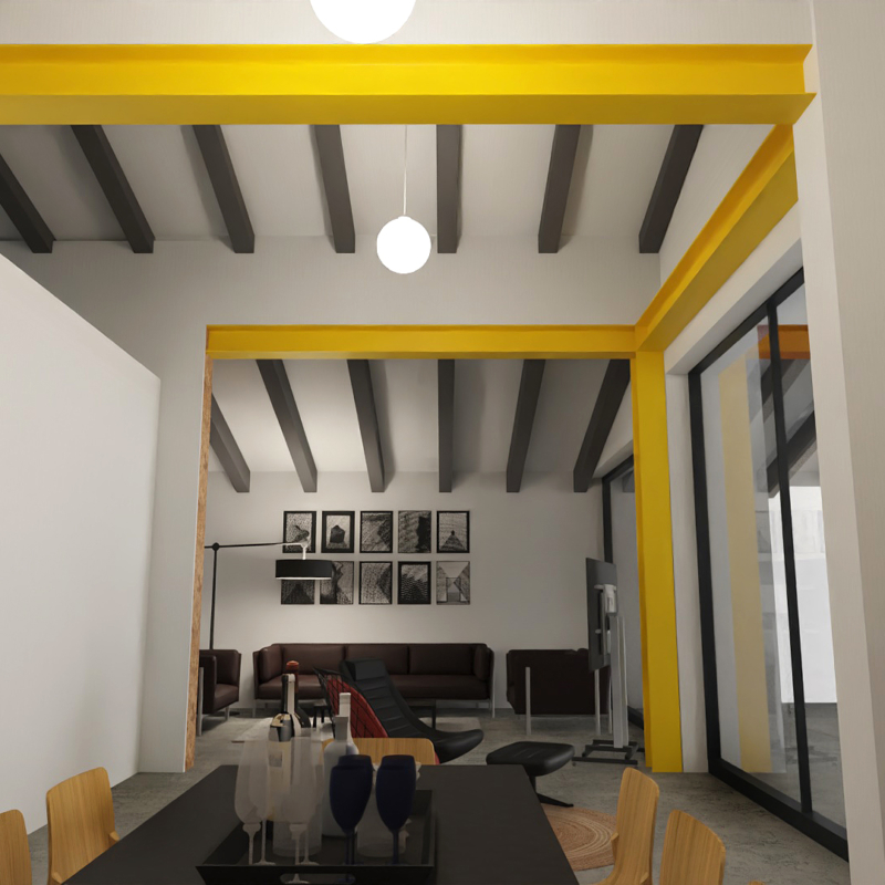 Estéticamente, gracias al buen gusto de los propietarios, conseguimos un resultado inmejorable. Paredes y techos blancos, con viguetas grises, suelo de microcemento gris en los espacios abiertos, tarima y porcelánico imitación madera en espacios más privados, carpintería exterior color antracita, puertas correderas de gran formato conformadas por paneles OSB, incluyendo una pared en el recibidor, y vigas metálicas pintadas en color amarillo (Pantone Illuminating Yellow), que dan un toque de carácter al conjunto.