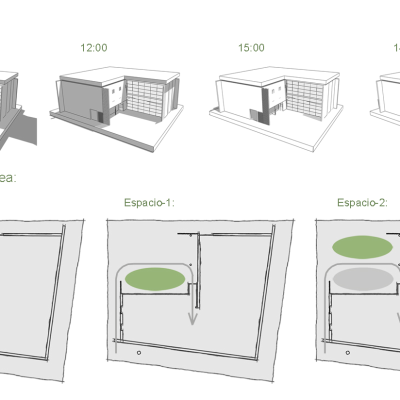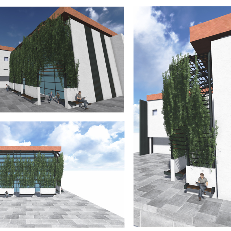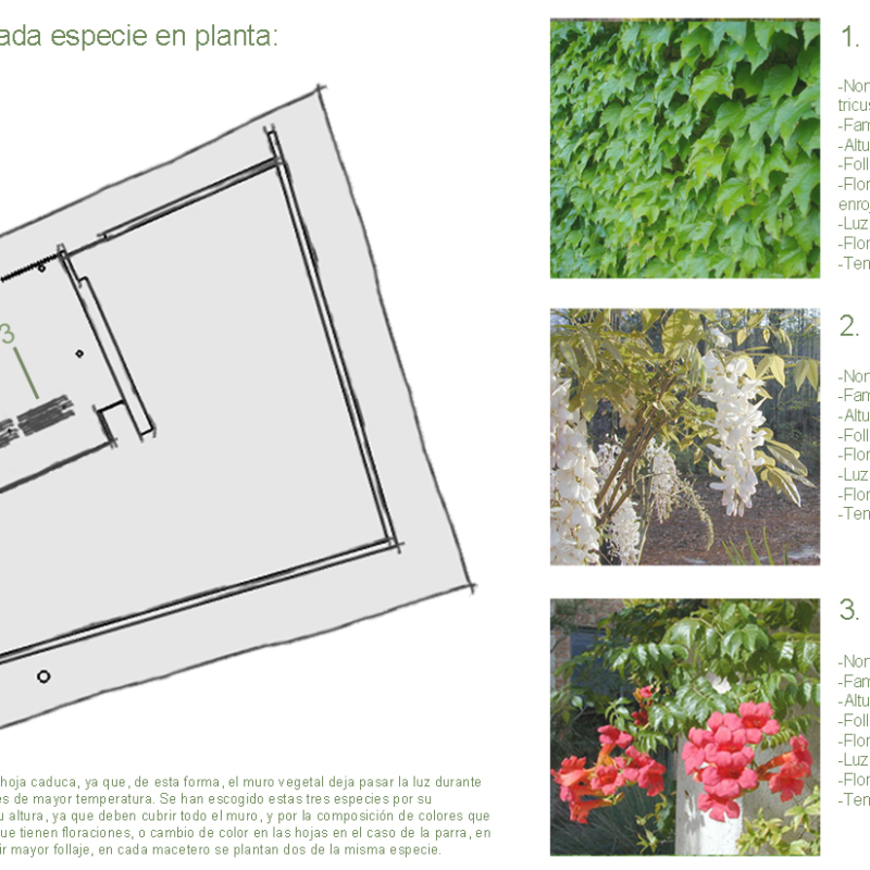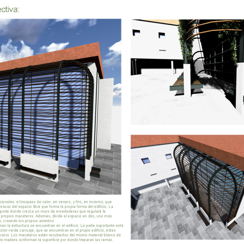 Nuestra propuesta consiste en la instalación de un muro vegetal compuesto por enredaderas de hoja caduca, una solución sostenible y eficiente. Este diseño permite que las enredaderas dejen pasar la luz en invierno, mientras que en verano proporcionan sombras que ayudan a reducir la temperatura interior del edificio, mejorando así su eficiencia energética.