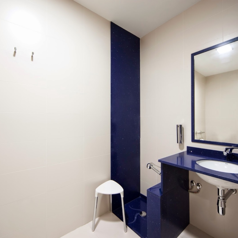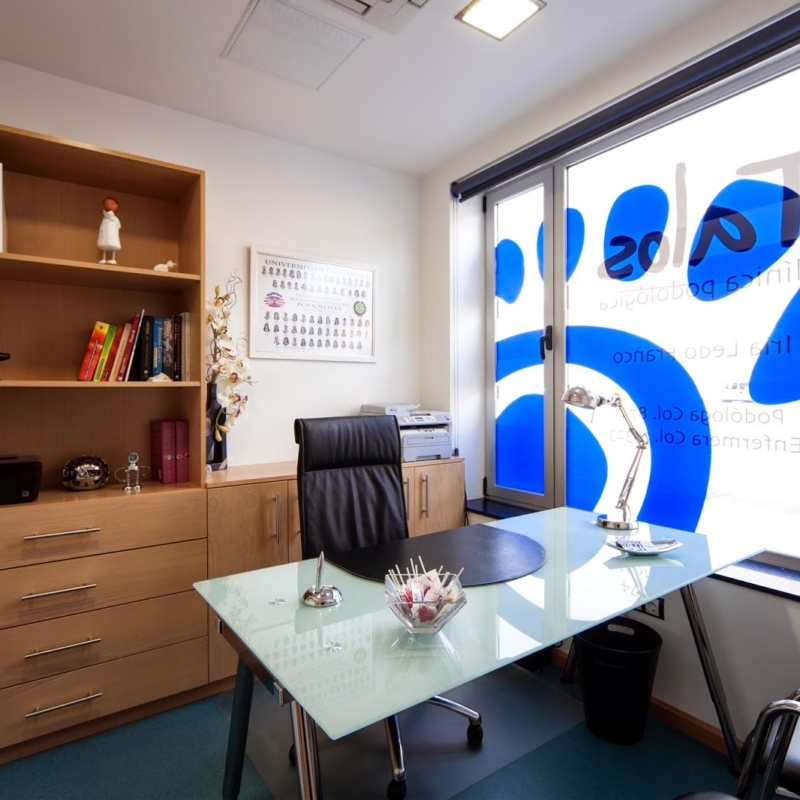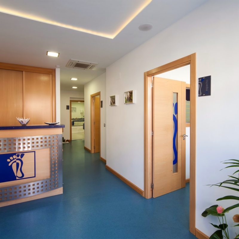 El diseño interior, inspirado en la planta (huella) del pie, integró elementos de ergonomía y accesibilidad para mejorar la experiencia del paciente. El color corporativo elegido, un azul característico de la sanidad, fue clave para dar al espacio un carácter desenfadado, manteniendo un ambiente profesional y acogedor.