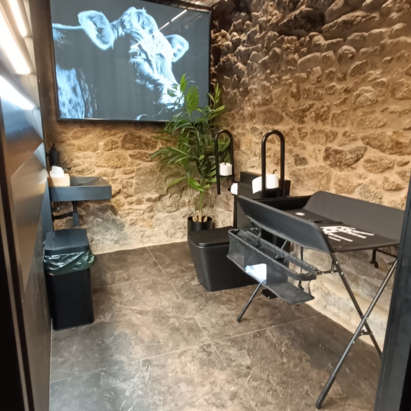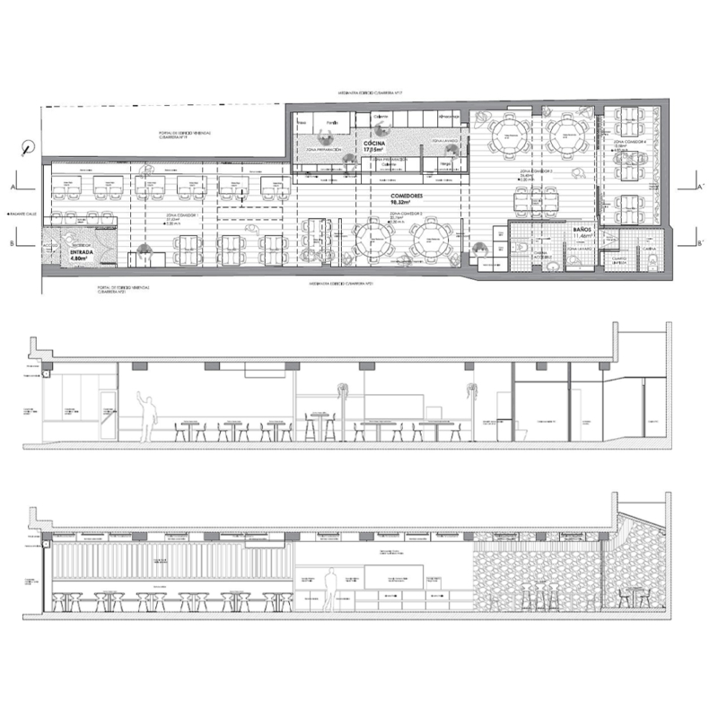 Al entrar, se encuentran dos líneas de mesa baja con banco corrido, creando un ambiente más informal. A continuación, dos zonas de comedor con mesas redondas ofrecen un espacio más formal y serio. A un costado, se sitúa el núcleo de cocina, mientras que la estación de servicio para neveras y bebidas separa el núcleo de aseos, que cuenta con un anteaseo y dos cabinas. Al fondo del local, se accede a un patio cubierto que funciona como comedor reservado, proporcionando un ambiente más íntimo.
