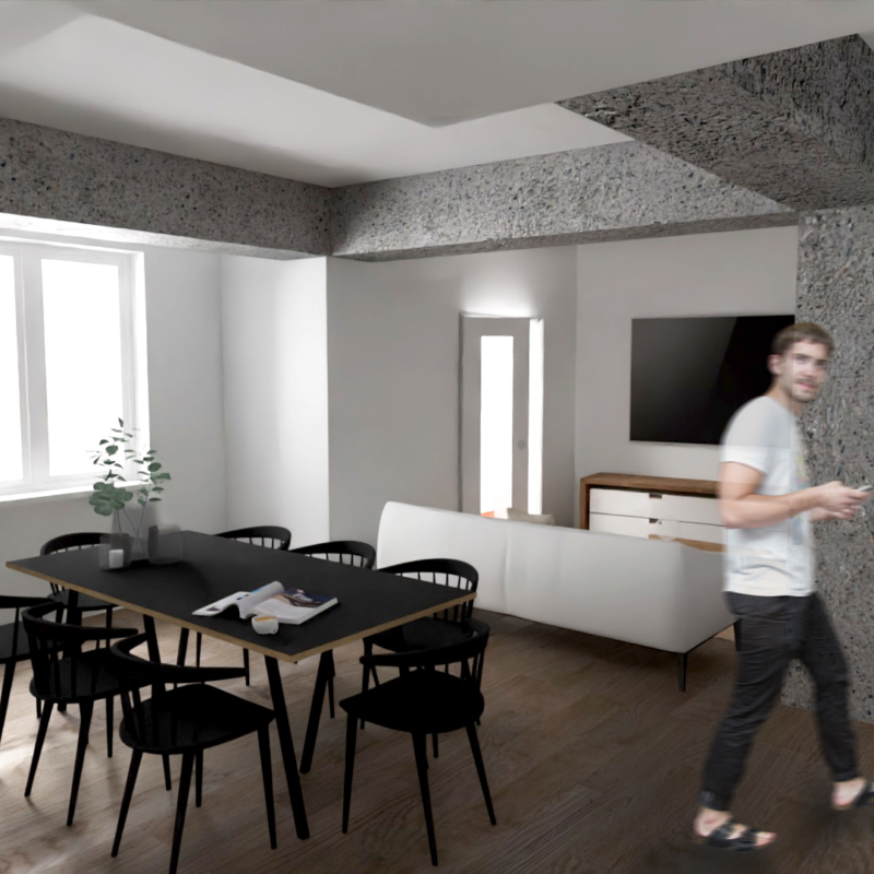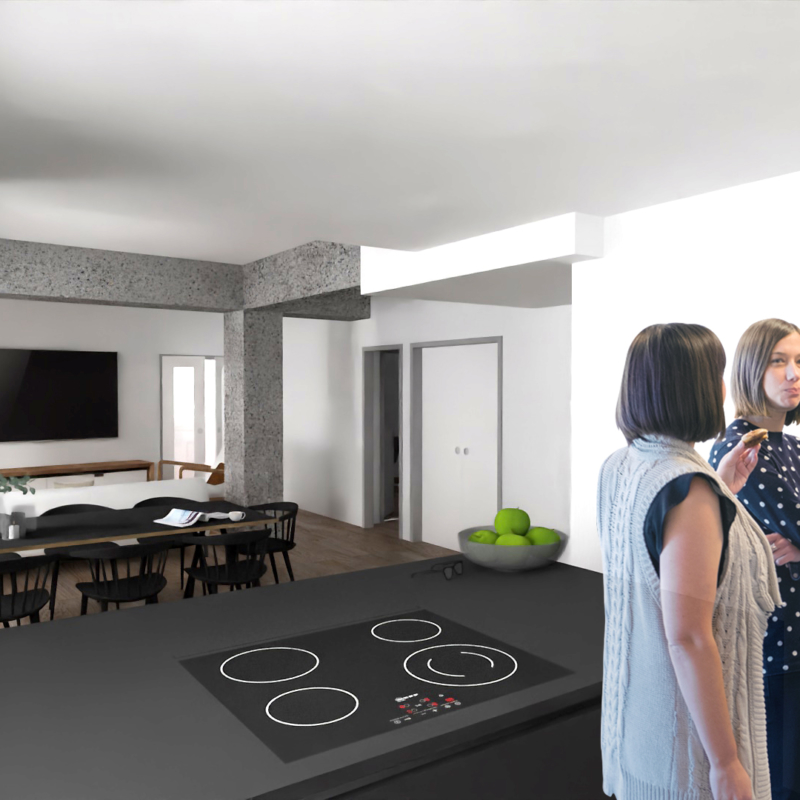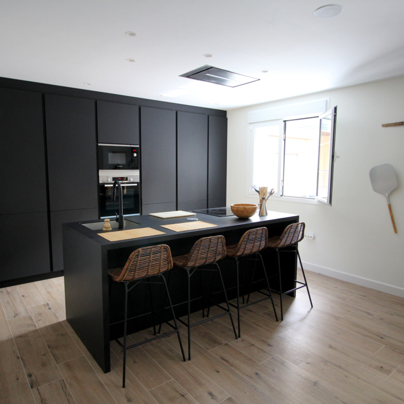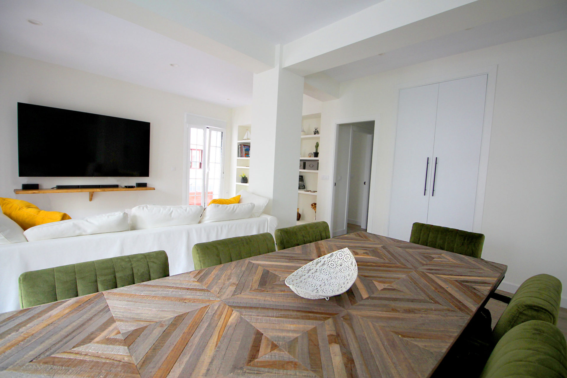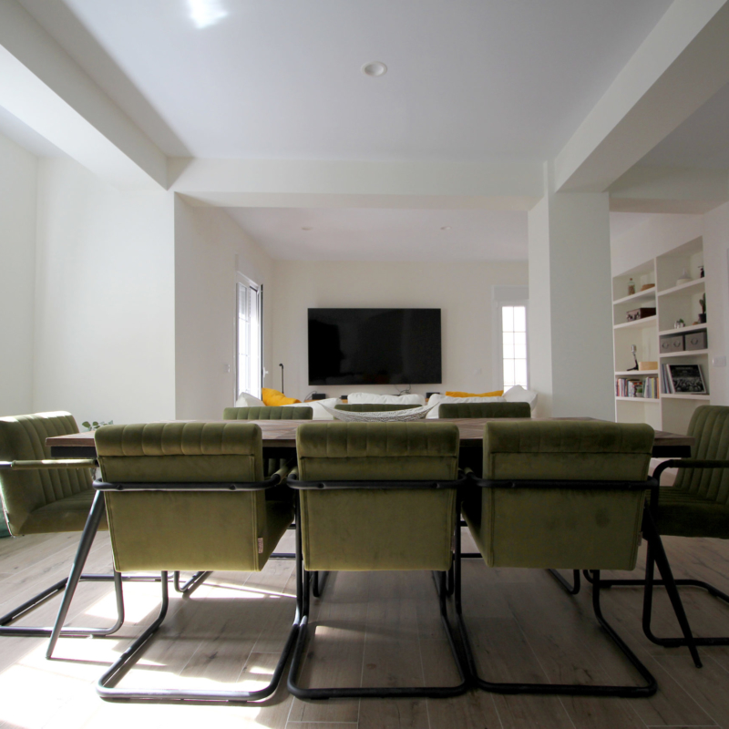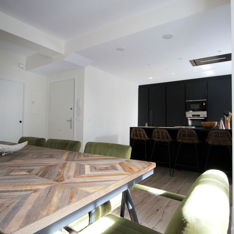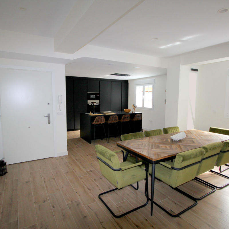 La nueva distribución de la vivienda crea un gran espacio abierto que integra la cocina, el comedor y el salón en un ambiente cohesivo y moderno. Este espacio cuenta con una gran televisión central, visible desde cualquier punto, y un sistema de audio empotrado en la barra de la cocina, que permite disfrutar del sonido en todo el área principal.