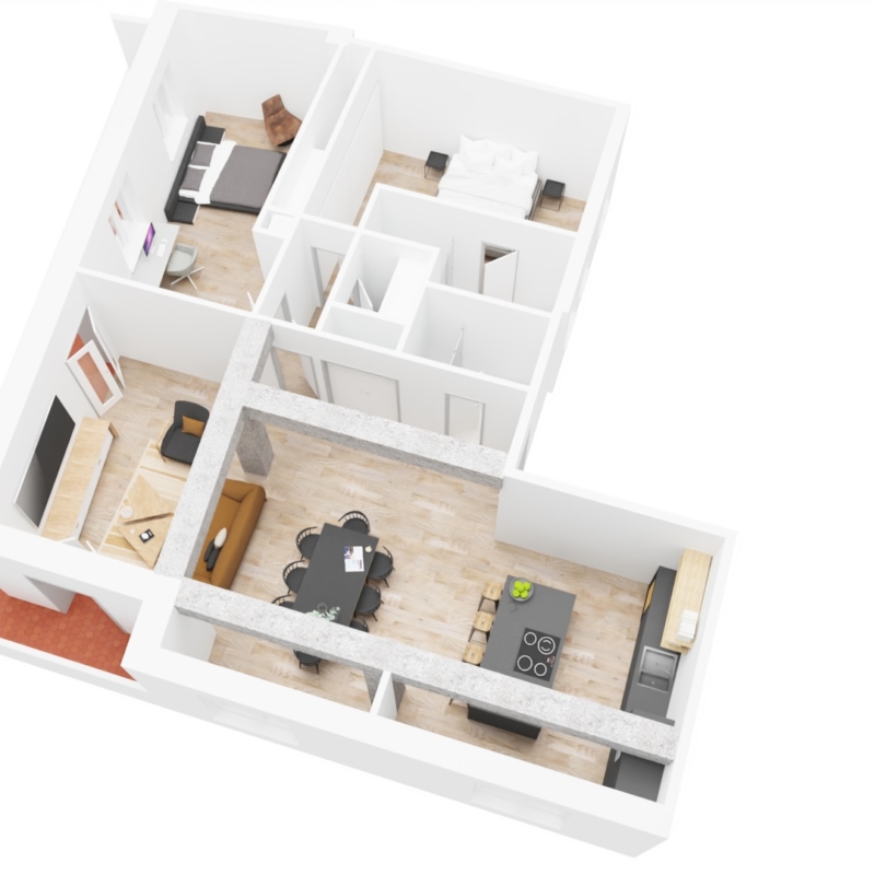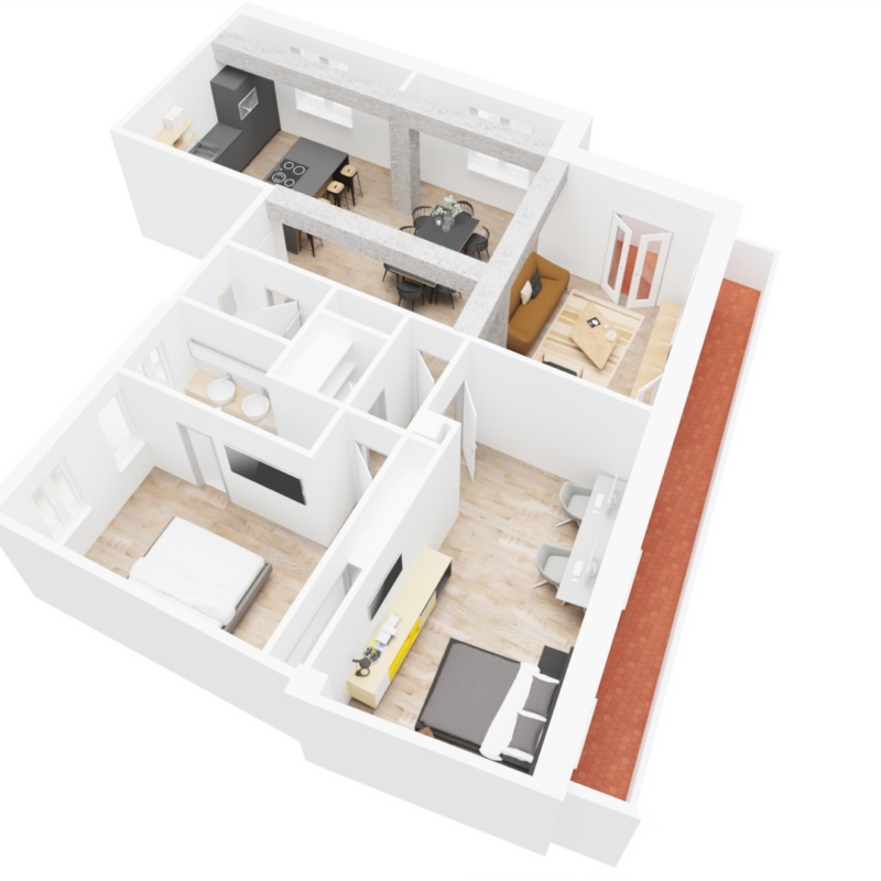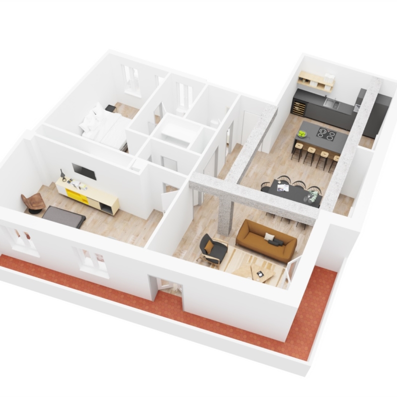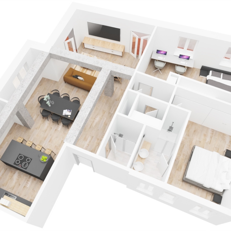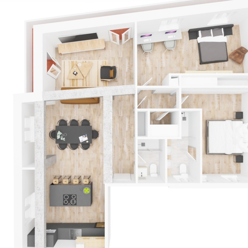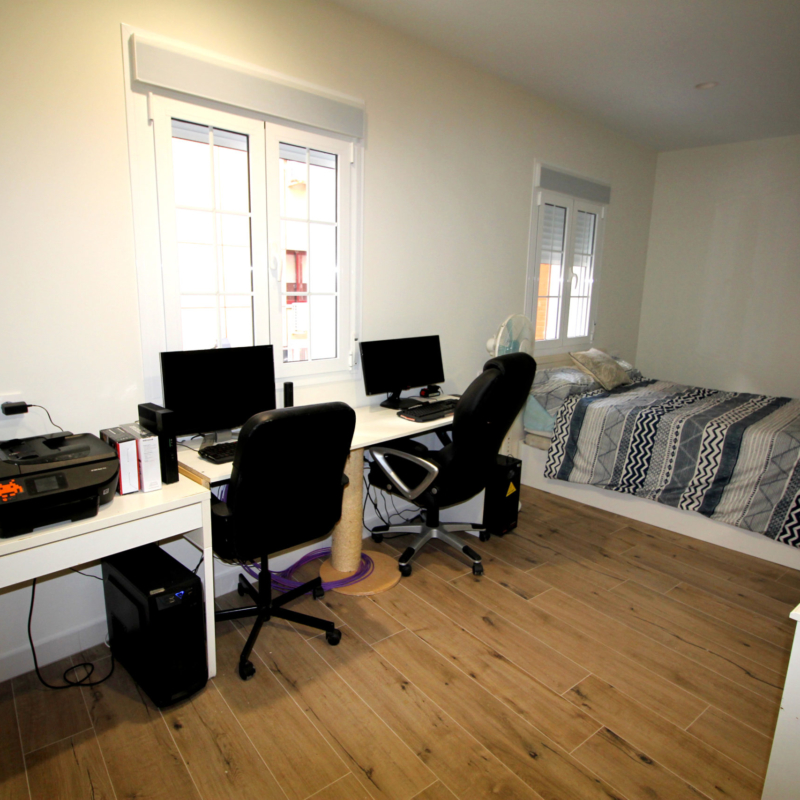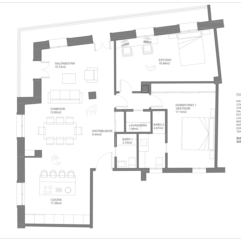 Además, la vivienda se completa con un despacho que también funciona como cuarto de invitados, y un dormitorio doble que se separa de las áreas comunes por un núcleo de cuartos húmedos que incluye dos baños y un lavadero. Esta disposición garantiza la privacidad en las zonas de descanso, al tiempo que maximiza la funcionalidad y la comodidad en el hogar.