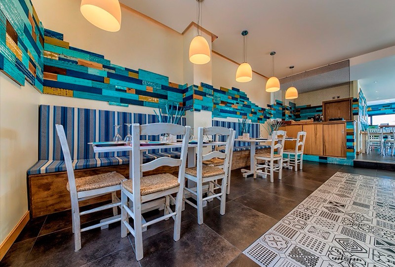El diseño interior del restaurante se inspiró en los sabores y tradiciones de la zona, integrando elementos que evocan la frescura del mar y la riqueza de la tierra. Para los grabados expuestos en el local, colaboramos con el ilustrador local Gaby Shelby, cuyas obras aportan un toque auténtico y personalizado al ambiente.