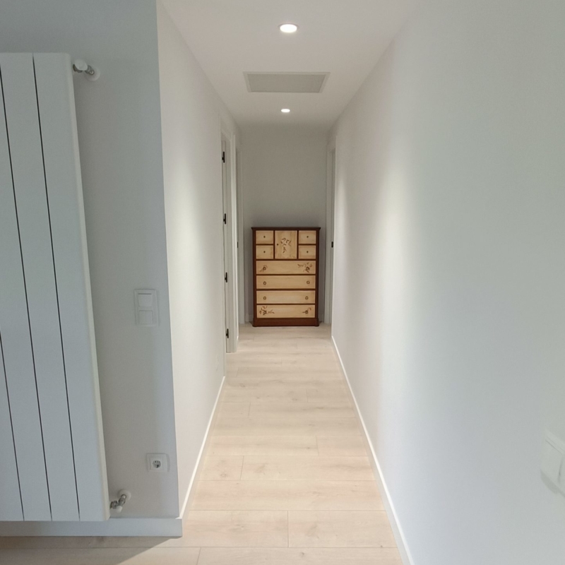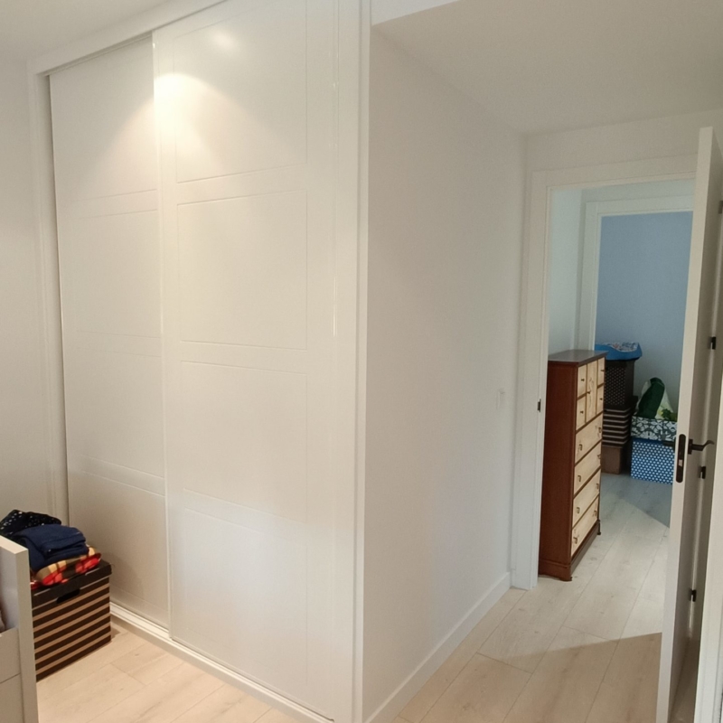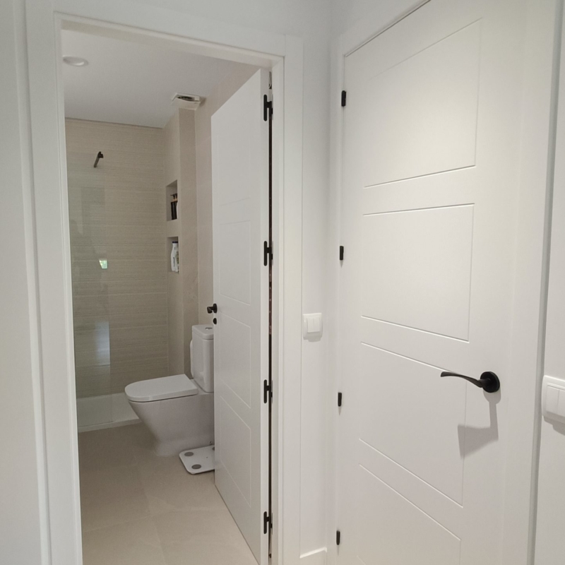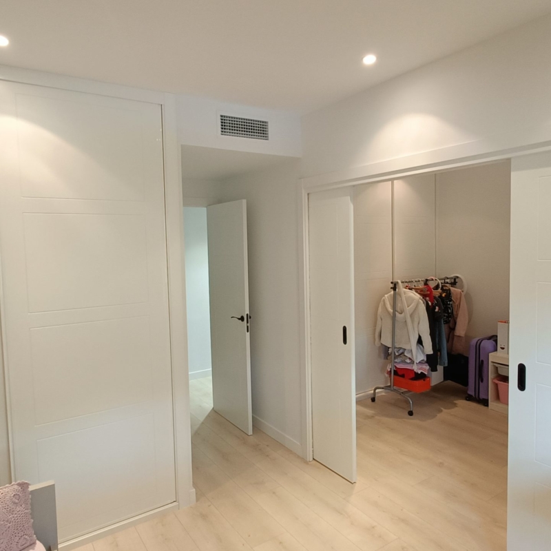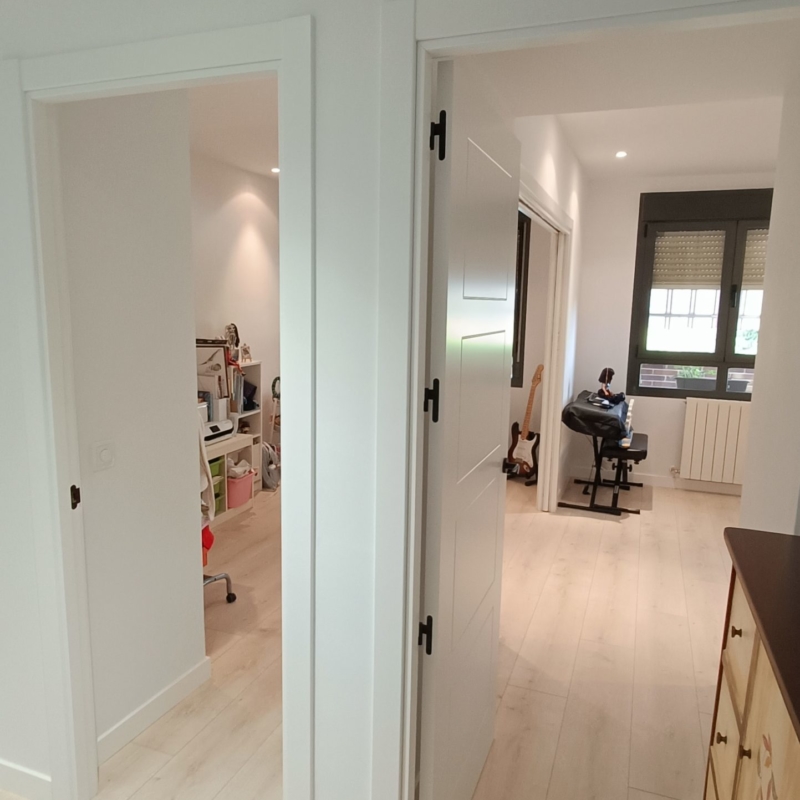 Se reemplazaron todas las carpinterías de las puertas de paso por nuevas de diseño pico de gorrión, lacadas en blanco con herrajes en acabado negro. Asimismo, se instalaron nuevos armarios de mayor altura con más capacidad de almacenamiento, y sus puertas correderas se diseñaron en consonancia con las puertas de paso. Todo el suelo fue renovado con un laminado de roble claro, aportando calidez y luminosidad al espacio.