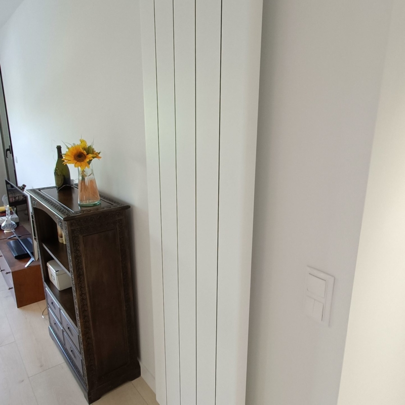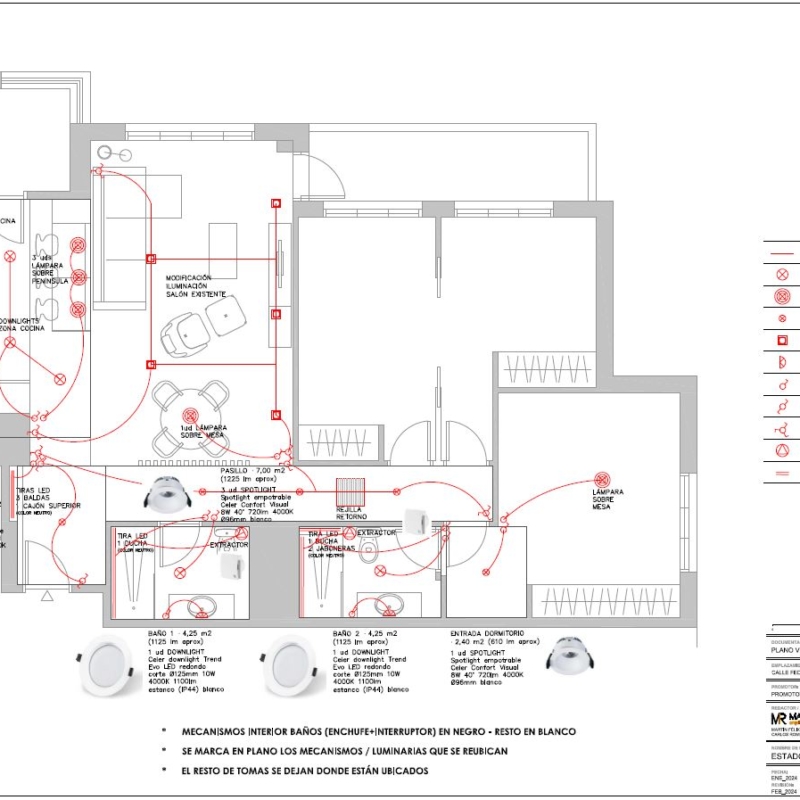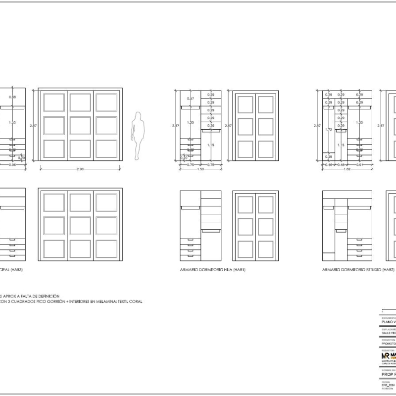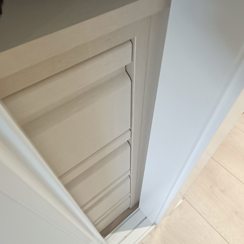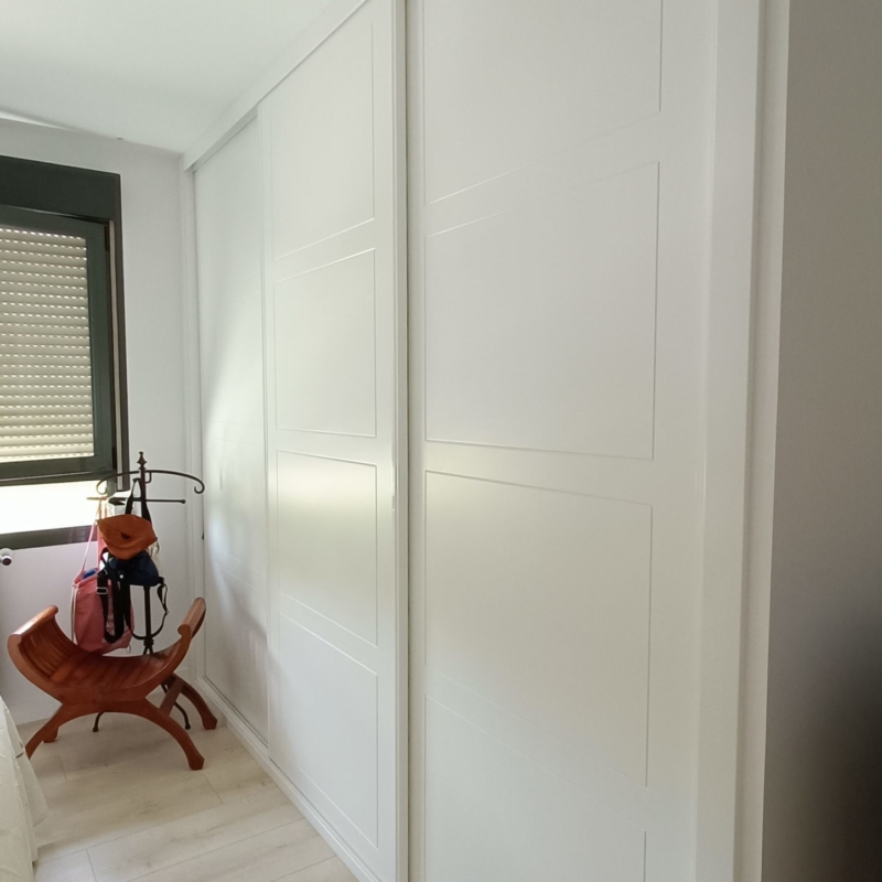Se reemplazaron todas las carpinterías de las puertas de paso por nuevas de diseño pico de gorrión, lacadas en blanco con herrajes en acabado negro. Asimismo, se instalaron nuevos armarios de mayor altura con más capacidad de almacenamiento, y sus puertas correderas se diseñaron en consonancia con las puertas de paso. Todo el suelo fue renovado con un laminado de roble claro, aportando calidez y luminosidad al espacio.