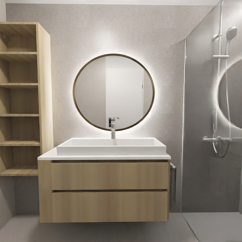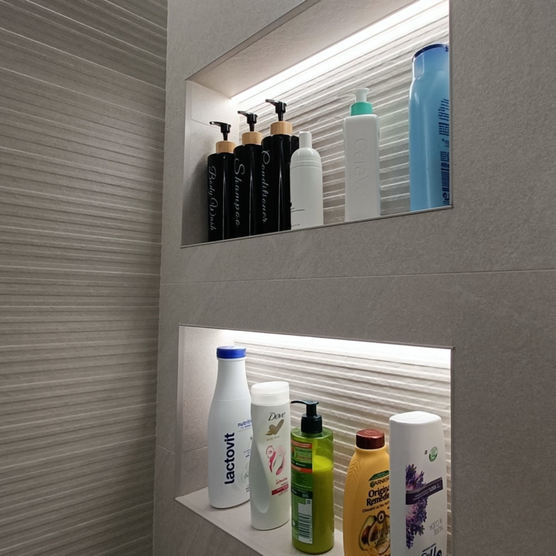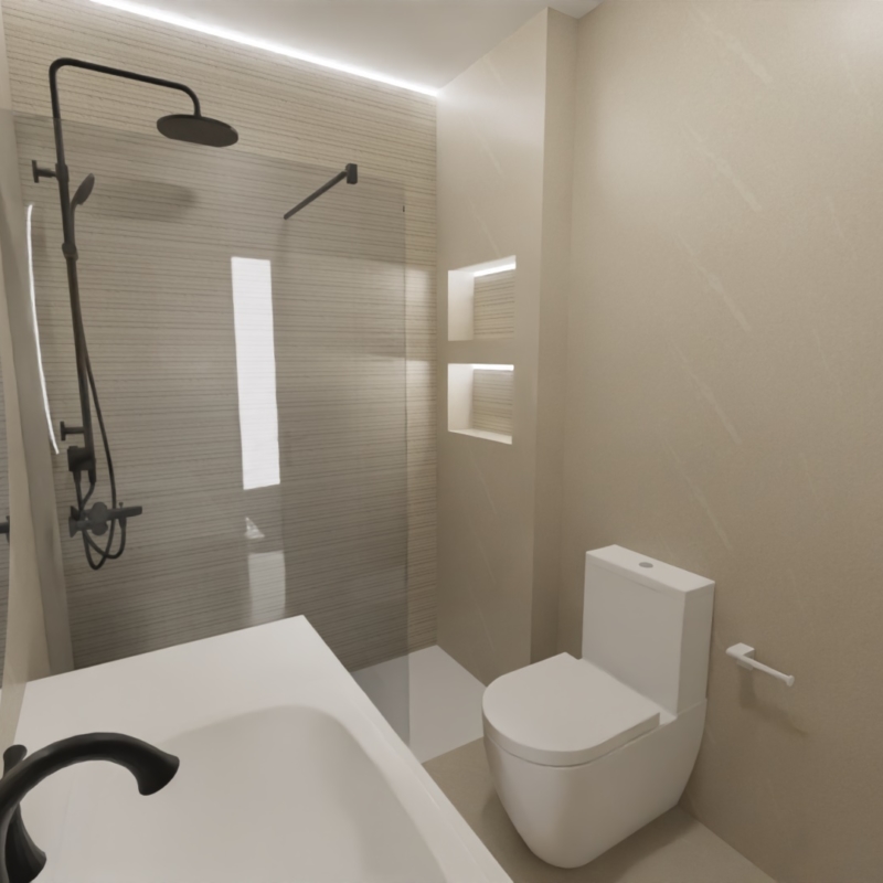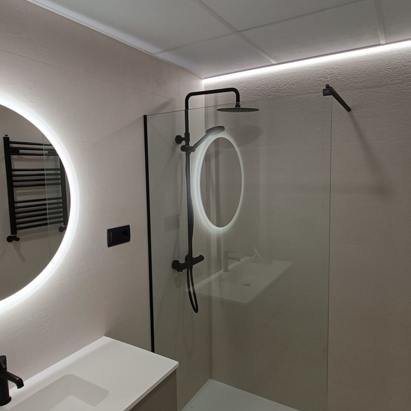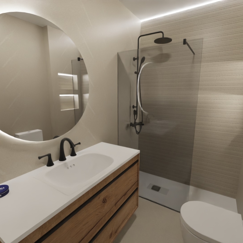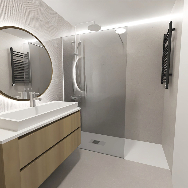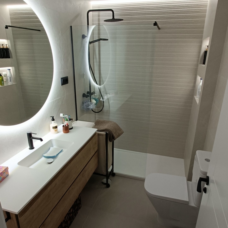Ambos baños fueron completamente reformados, sustituyendo las bañeras por platos de ducha, reubicando elementos y combinando nuevas cerámicas para el alicatado y solado. También se instalaron toalleros y se renovó todo el equipamiento para mejorar la funcionalidad y el confort.