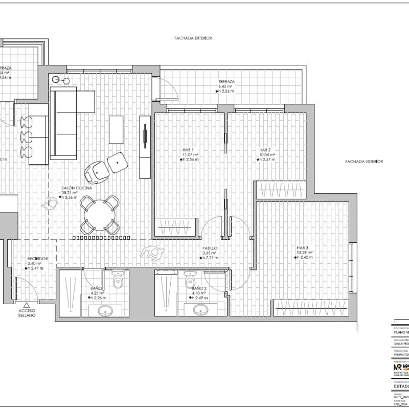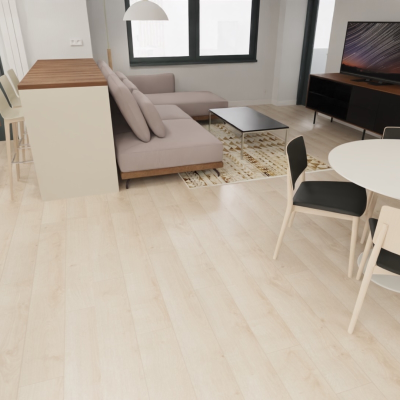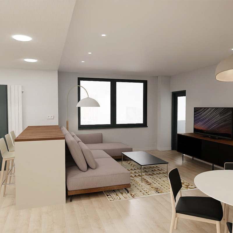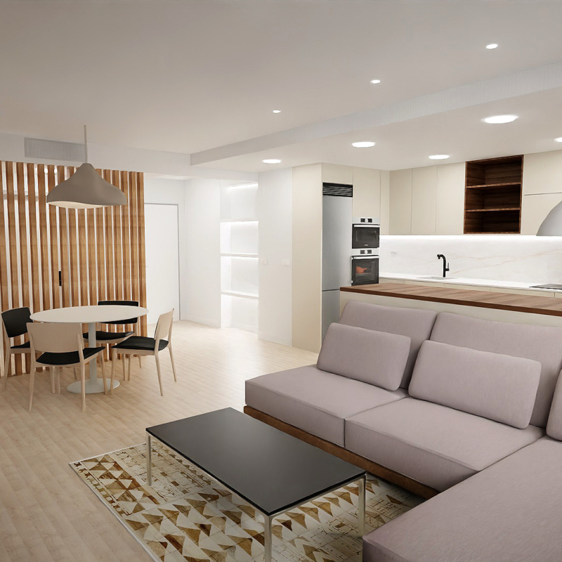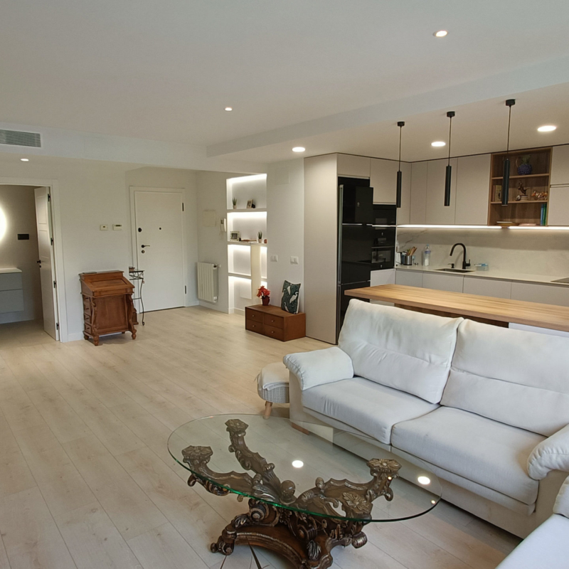 En massa&romero.com, realizamos una reforma integral de una vivienda tipo piso de 152 m² en Boadilla del Monte (Madrid). Uno de los requisitos principales de las clientas era mantener una comunicación visual entre el salón y la cocina. Tras presentar la propuesta en planos y 3D, demostramos que unificar ambas estancias no solo crearía un gran espacio abierto, sino que también permitiría que la luz natural llegara hasta la entrada, rompiendo la longitud del pasillo.
