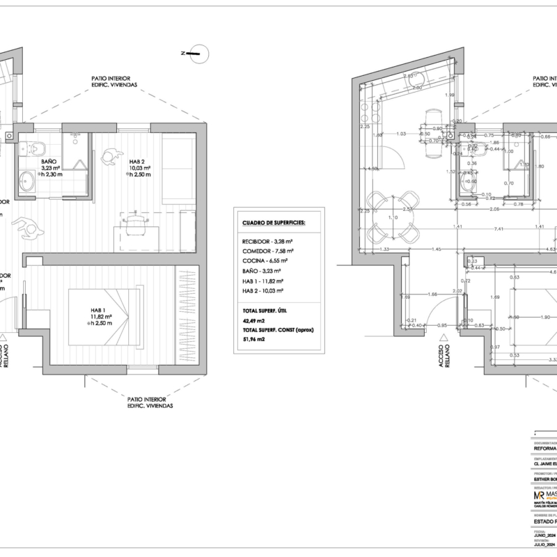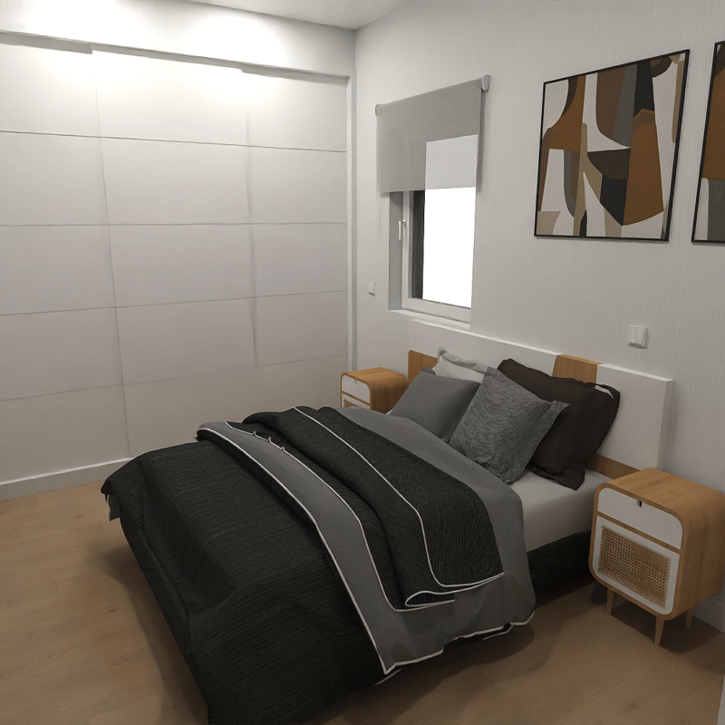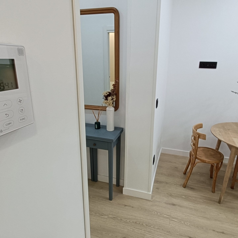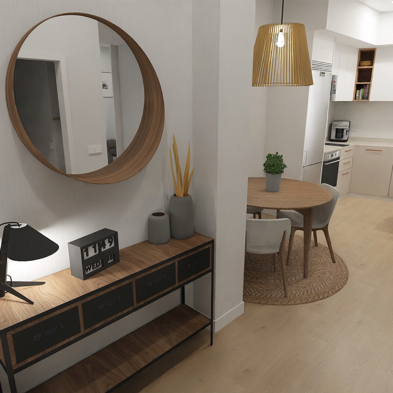 Se amplia la zona de entrada generando un espacio agradable de recepción a la vivienda, se renuevan las instalaciones tanto de fontanería, saneamiento, electricidad, iluminación, como de clima creando una red de conductos centralizada; se cambian las carpinterías tanto interiores de madera como exteriores de PVC para conseguir un mayor aislamiento.