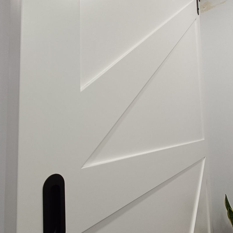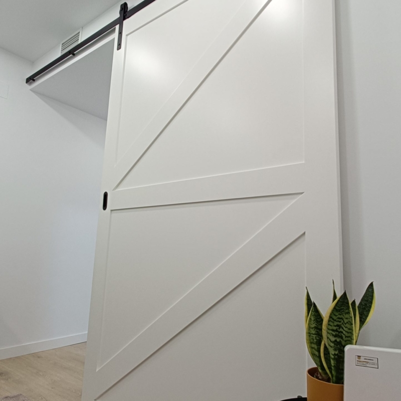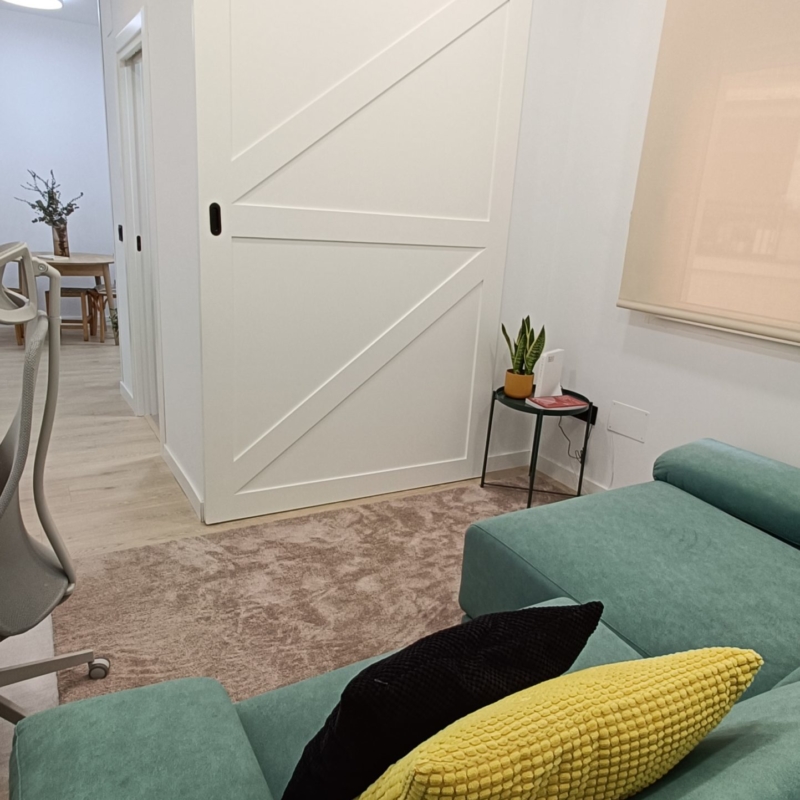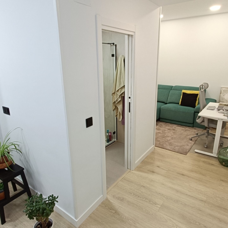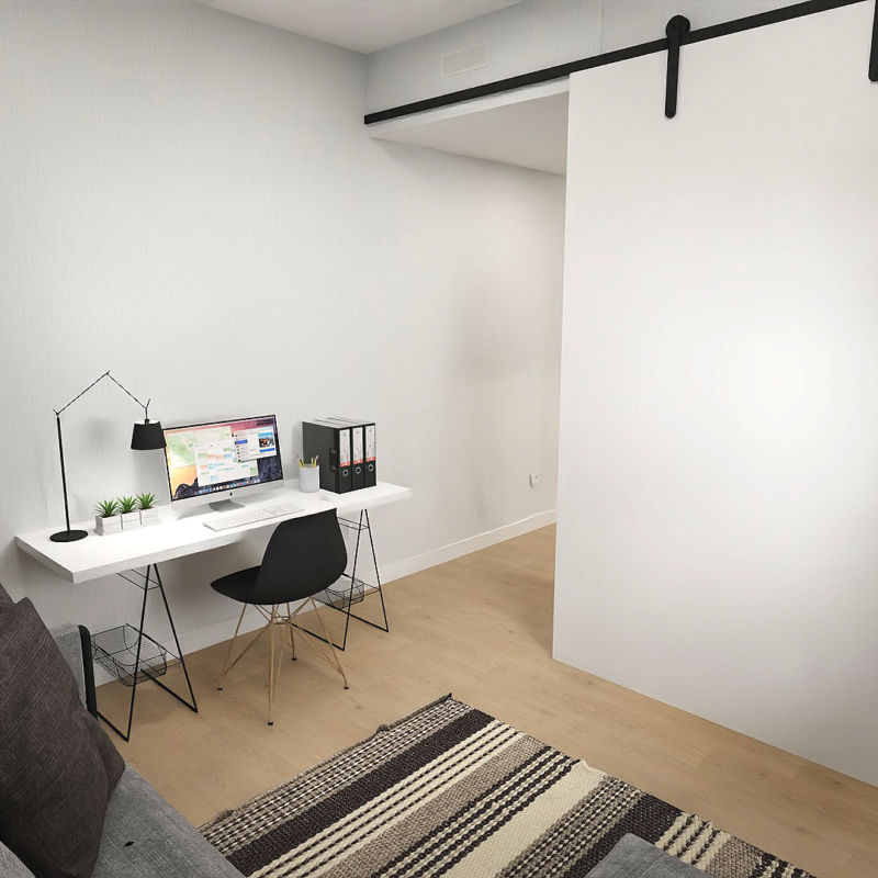 La zona de estar se delimita con una puerta corredera tipo granero a medida con guía que permite que este espacio se pueda cerrar convirtiéndolo en un dormitorio de visita con su sofá cama.