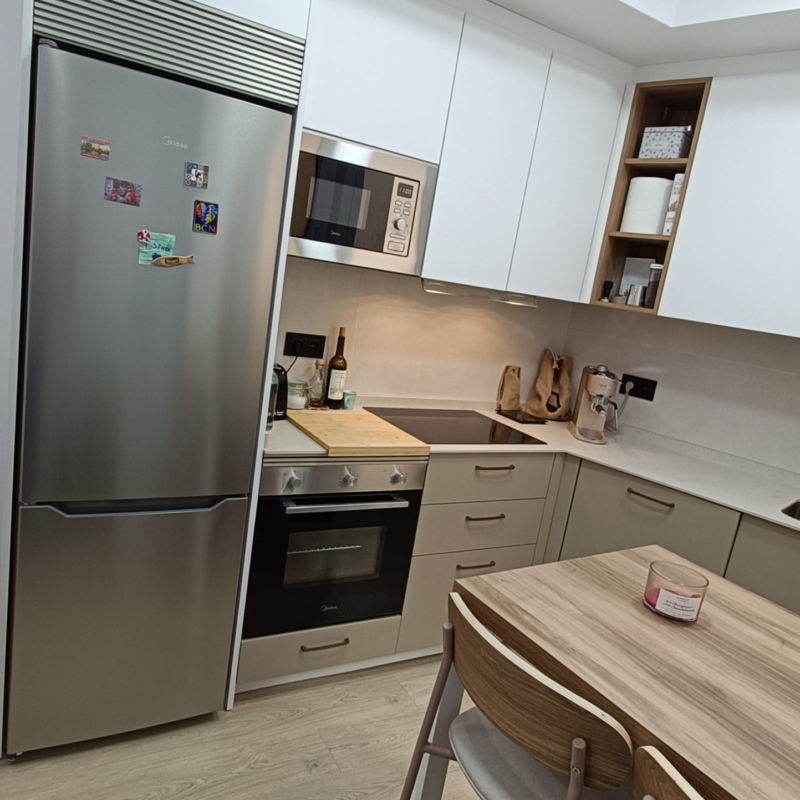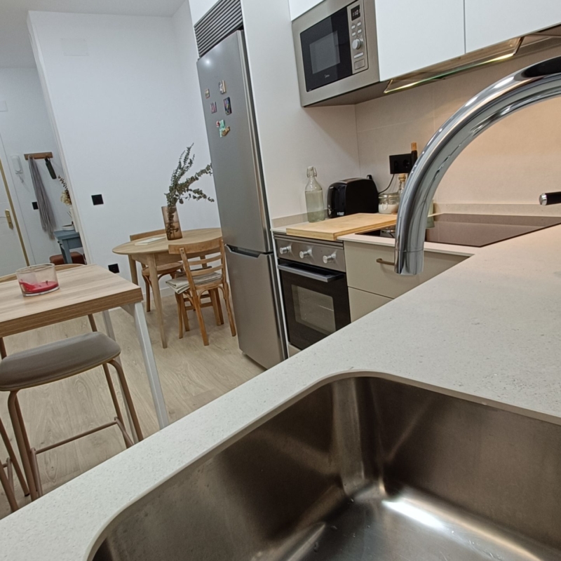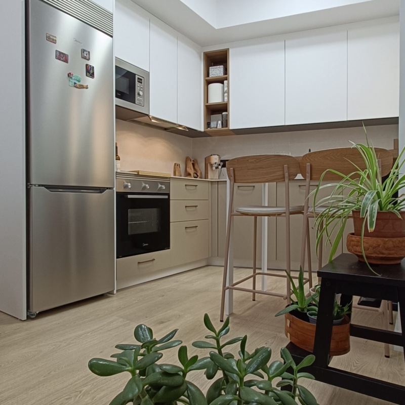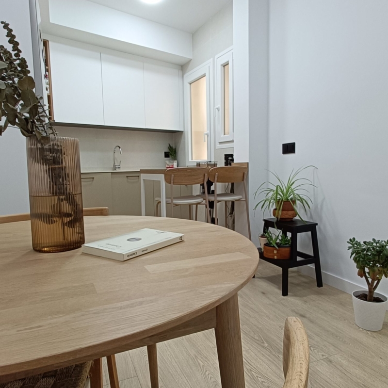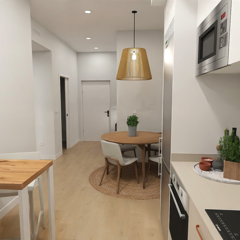 Se diseña una nueva cocina abierta junto con una pequeña zona de barra, totalmente equipada con electrodomésticos y nuevas tomas, ubicada de manera que dispone de gran cantidad de luz natural generando un agradable espacio comunicado directamente con comedor y estar.