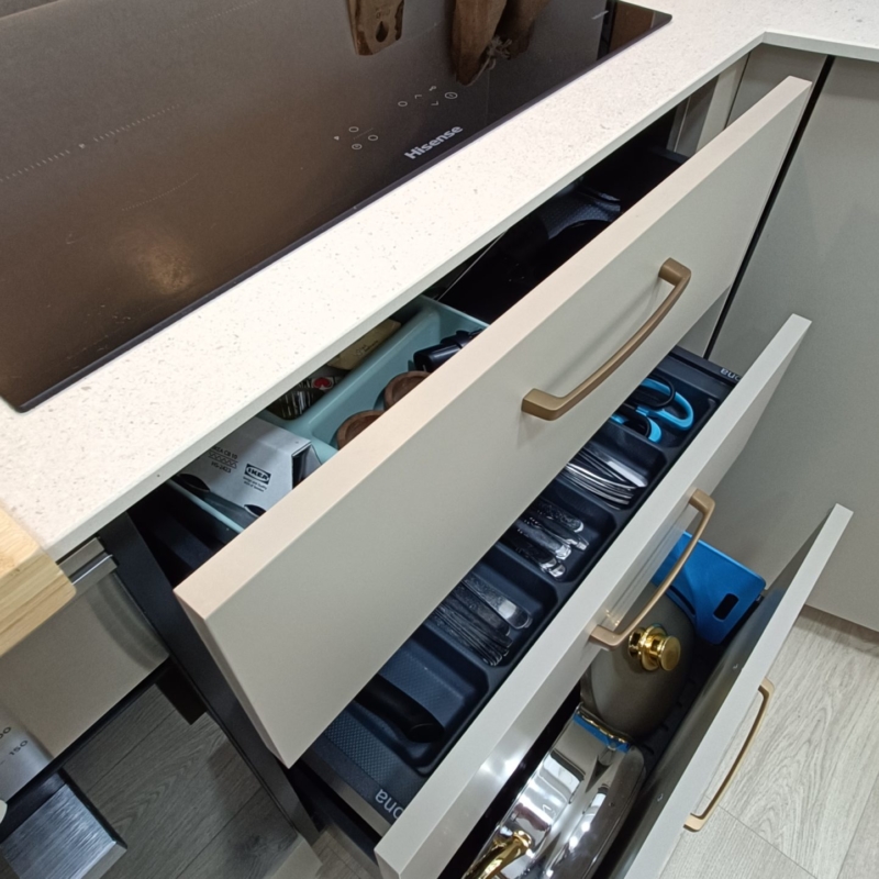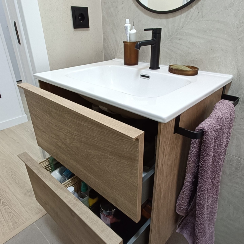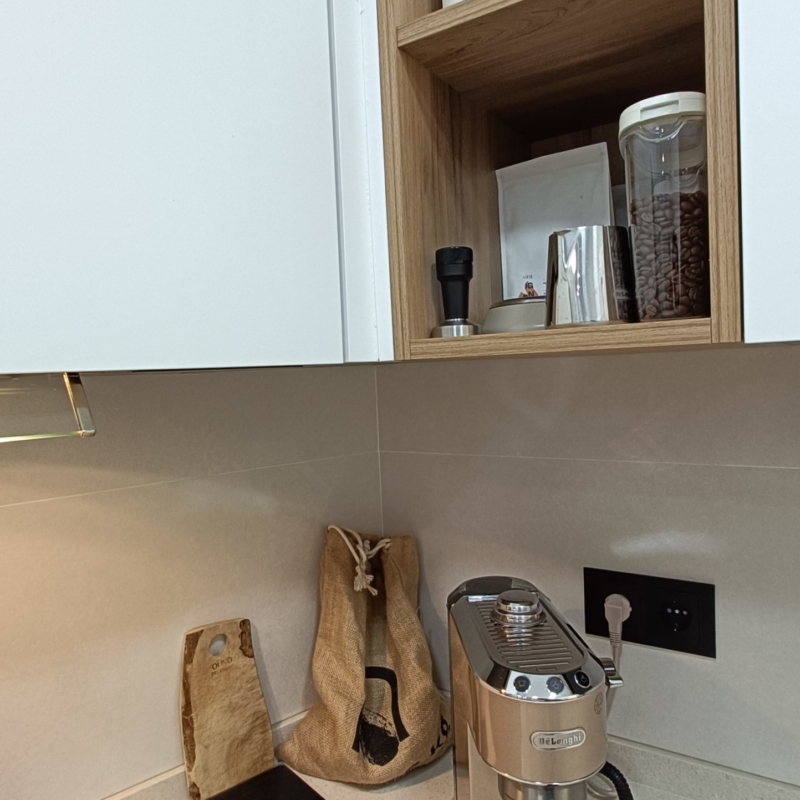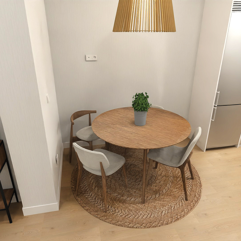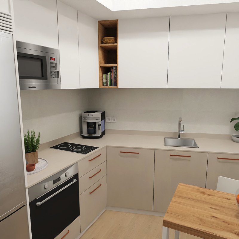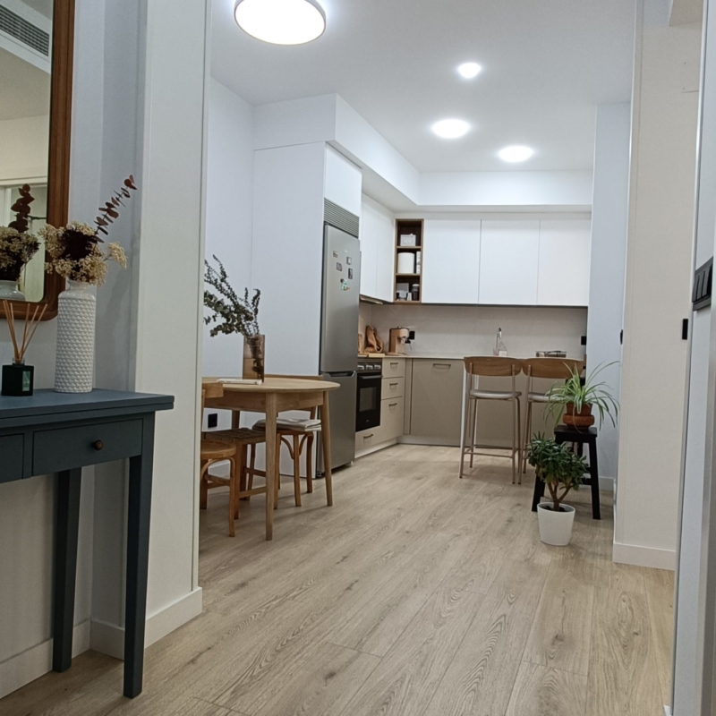 Se diseña una nueva cocina abierta junto con una pequeña zona de barra, totalmente equipada con electrodomésticos y nuevas tomas, ubicada de manera que dispone de gran cantidad de luz natural generando un agradable espacio comunicado directamente con comedor y estar.