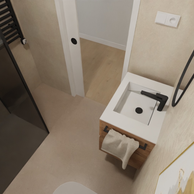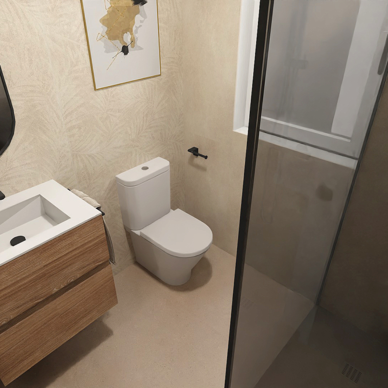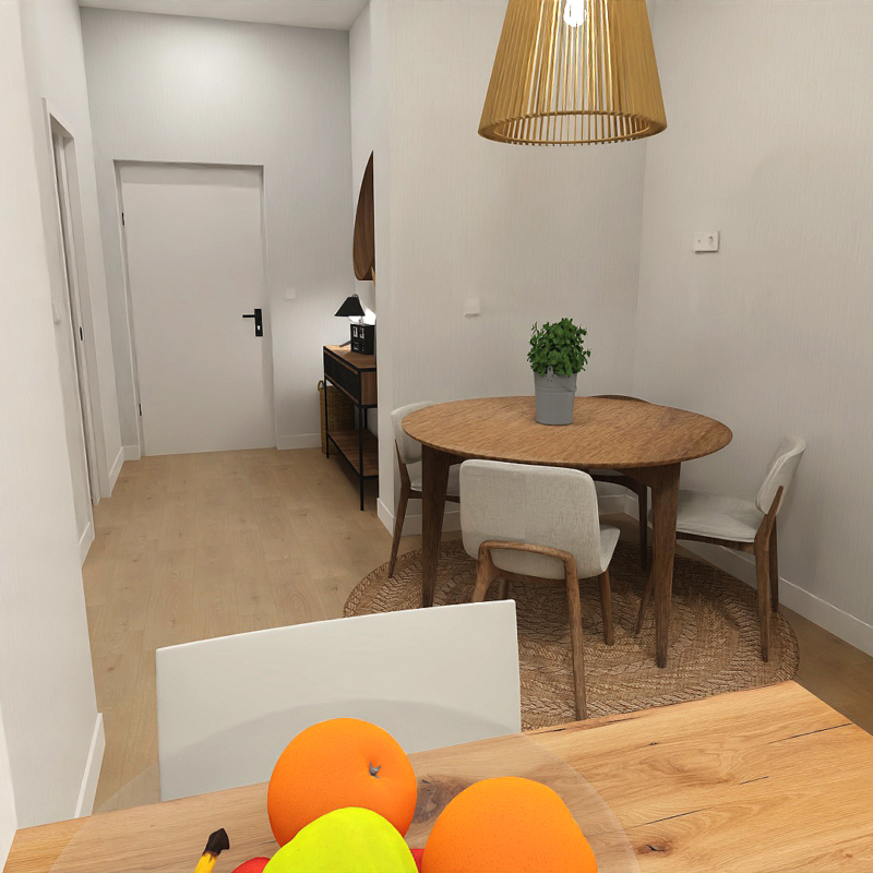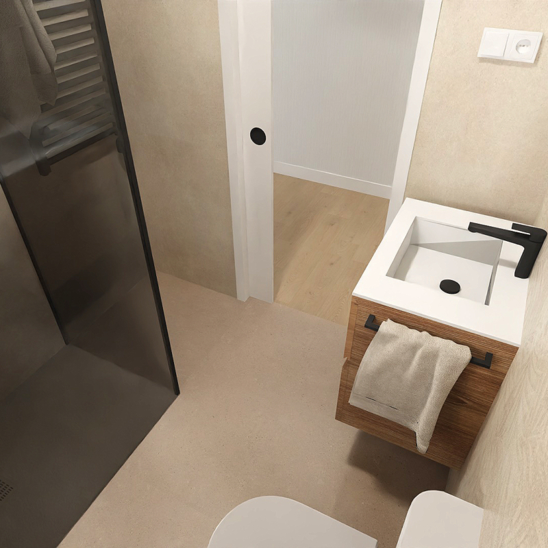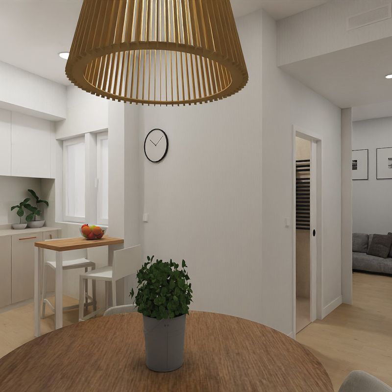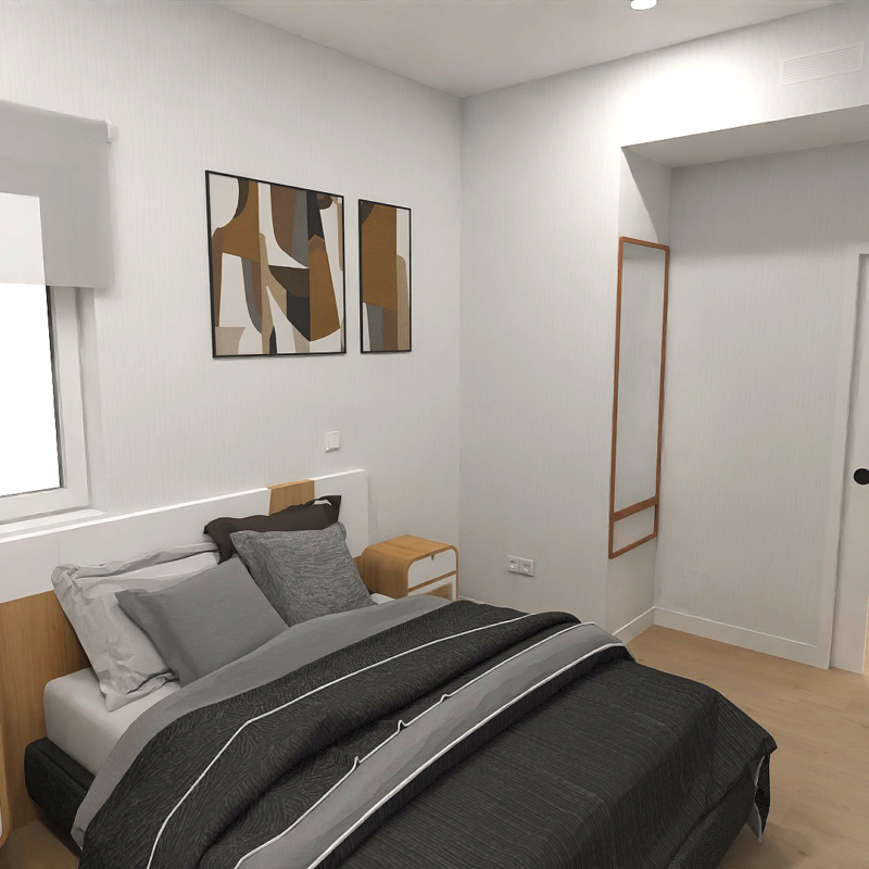 Con todo ello se define una propuesta, donde por un lado tenemos un núcleo de baño que nos distribuye dos amplios espacios, uno de comedor cocina comunicado con la entrada y otro de estar con zona de trabajo. Por otro lado reservamos el otro espacio para el dormitorio y un gran armario ropero que cierra el fondo de la habitación, supliendo así las necesidades solicitadas.