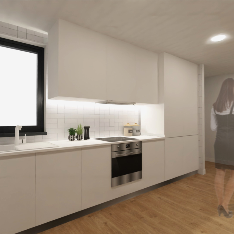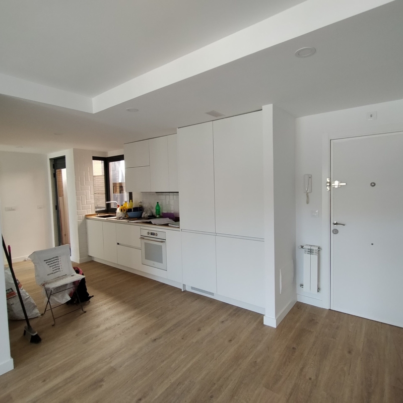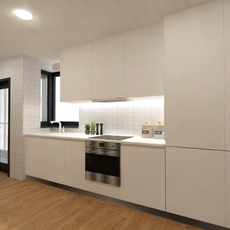 - Redistribución de Espacios: Eliminación del pasillo y la cocina tubular para crear una amplia estancia en forma de L que integra cocina, salón y comedor, además de servir como distribuidor hacia el resto de las estancias.