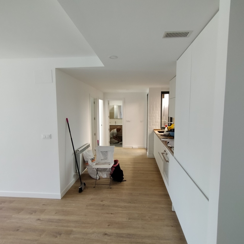 - Renovación de Suelos: Instalación de suelo laminado tipo roble (Wexford natural de Finfloor Finsa) con manto acústico y rodapié perimetral.
