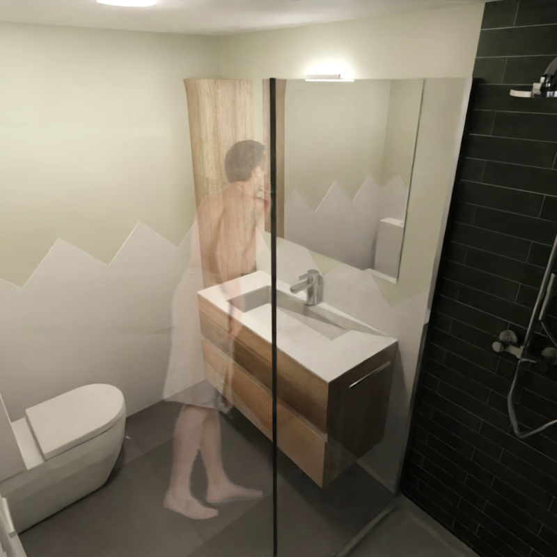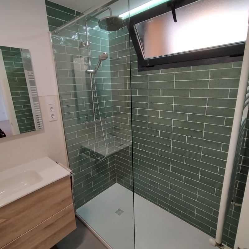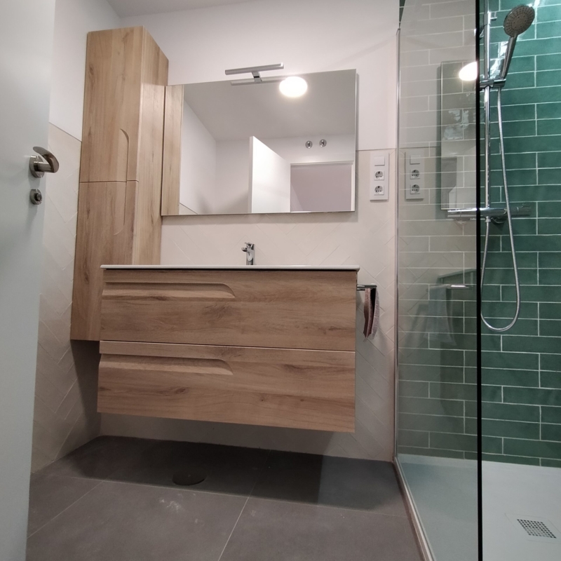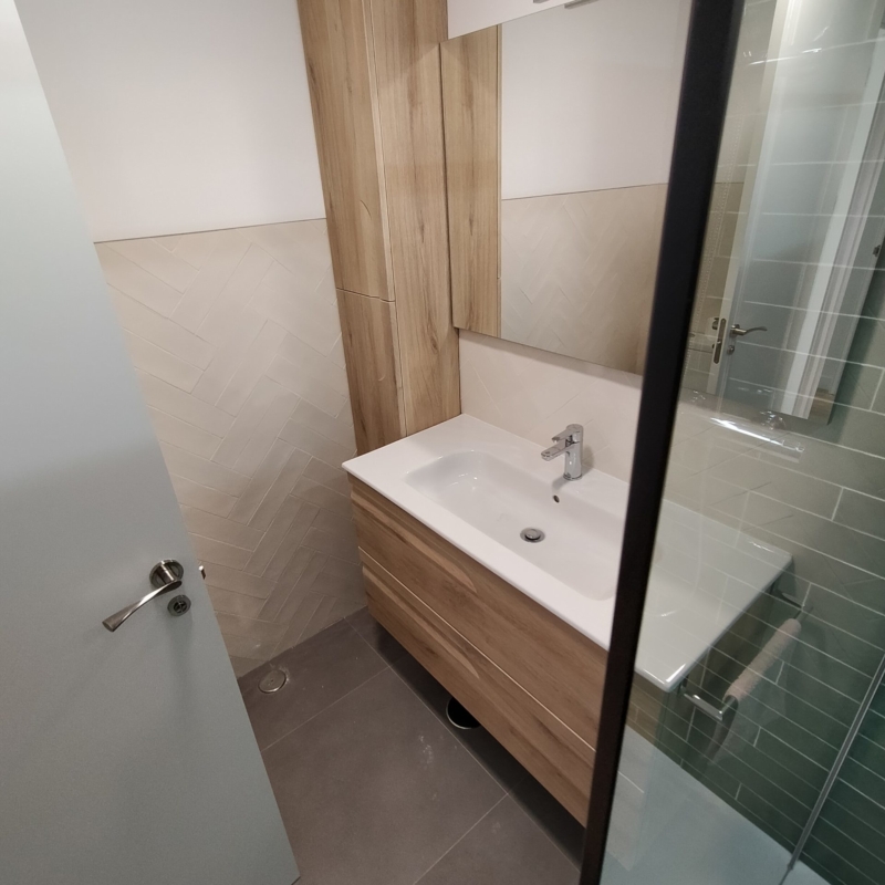 - Reforma Integral del Baño: Sustitución de la bañera por plato de ducha, renovación completa de sanitarios, alicatados y solado con cerámicas en diseños modernos como espiga diagonal, doble y matajunta.