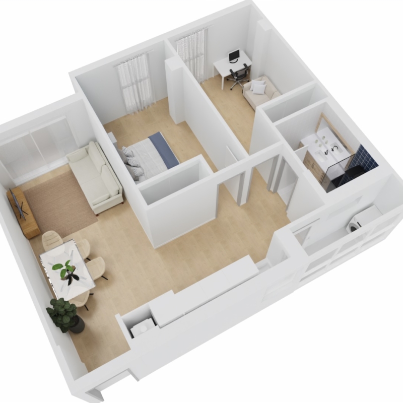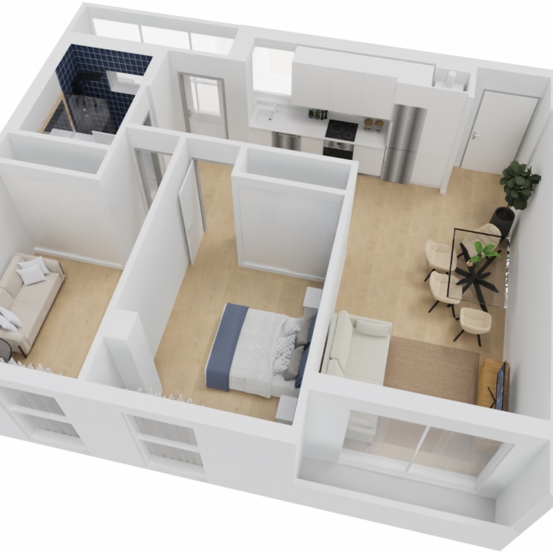 - Comodidad y Durabilidad: Materiales de alta calidad como el suelo laminado con manto acústico y electrodomésticos de última generación.